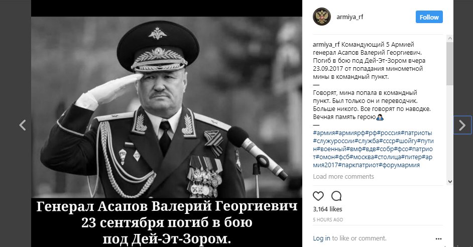 https://img-fotki.yandex.ru/get/198976/51604349.257/0_db9be_bb21daed_orig.jpgКомандующий 5-й общевойсковой армией генерал-лейтенант Валерий Асапов погиб в Сирии. Об этом сообщает РИА Новости со ссылкой на Минобороны.