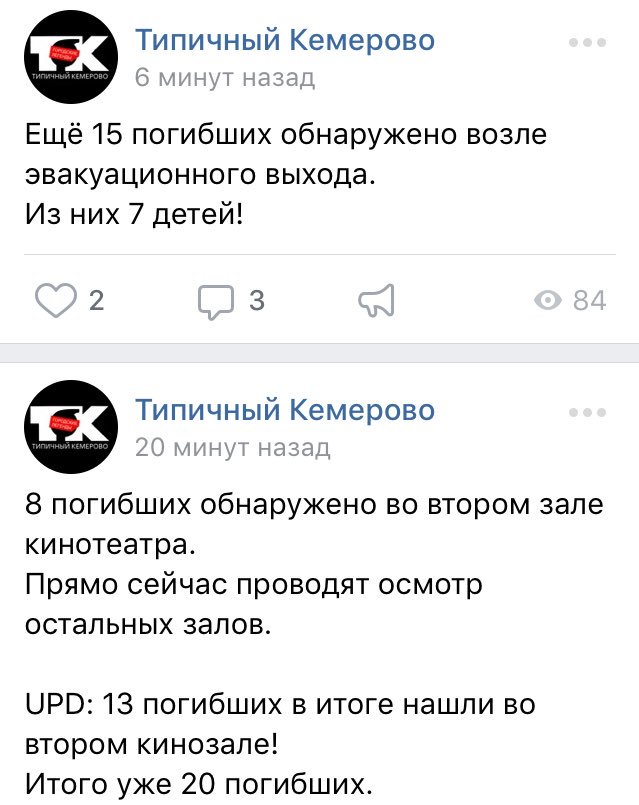 37 погибших и властям пришлось озвучить- 65 пропавших без вести!!!! А температура 600-700 градусов!!!!! Это же непостижимо!Пошли в воскресенье в кино. В мирное время. Кто ответит? Погибают дети, взрослые в огне без войны!!!!А жертвы страшные! И смерть страшная. И опять удар по русскому населению. И опять виновна власть, страшно виновата.Что думаете откупиться 1 миллионом рублей за погибших??? Или как привилегия -отвезти в Москву на лечение???? А кто вернет матерям их детей????