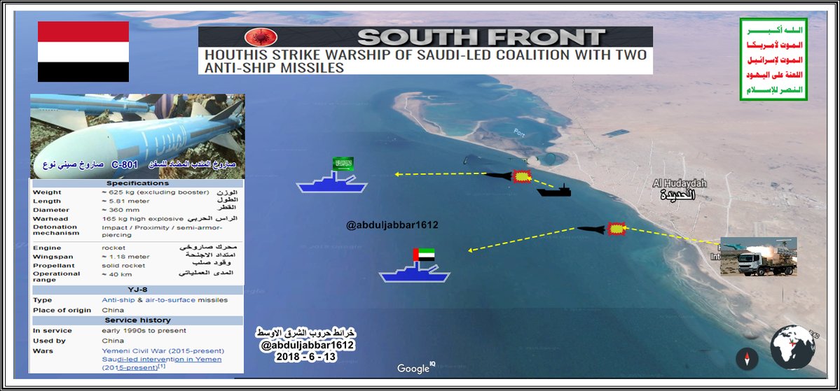 Попытка высадки десанта в порту Ходейды провалилась. Хуситы уничтожили один из десантных кораблей получивший попадание двух противокорабельных ракет https://almasirah.net/gallery/preview.php?file_id=17241 (хуситы утверждают, что ночью после сильного пожара и эвакуации погибших, корабль был оставлен экипажем и затонул) и фактически сорвали организованную высадку. Среди погибших были матросы и офицеры флота ОАЭ. Хуситы заявляют, что располагают силами и средствами для уничтожения и других кораблей интервентов у западного побережья Йемена.