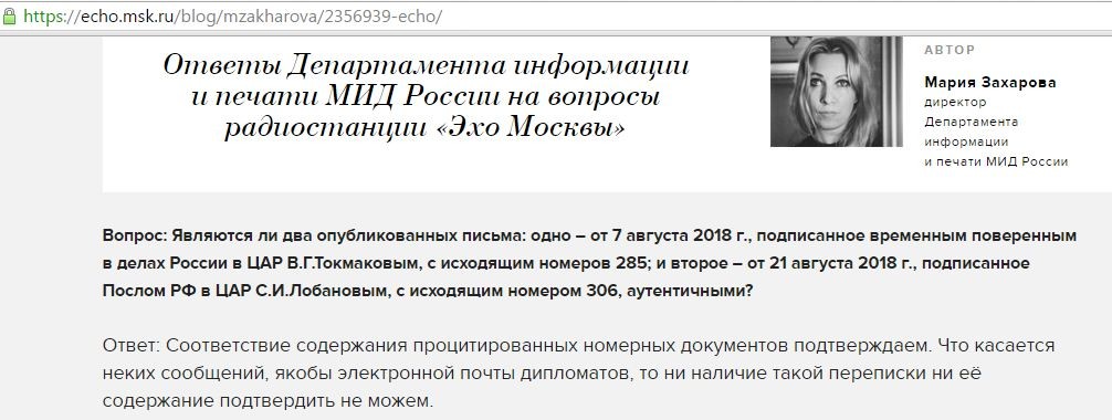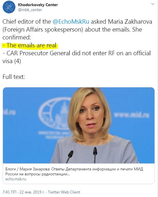 При этом, используя «Эхо Москвы» Ходорковский пытается слепить еще один фейк, будто бы Мария Захарова подтвердила электронную переписку.
